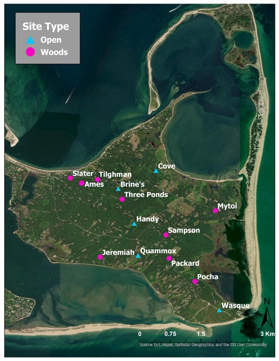To quantify the current densities of BL and LS ticks on Chappaquiddick, drag sampling was carried out along hiking trails from 31 May to 23 June 2023 and from 24 May to 21 June 2024. Lone star ticks are known to occur in a wider range of habitats than BL ticks [31], so we compared tick densities in open grasslands vs. shady woods. We selected a total of 5 open sites, which we refer to as meadows, and 9 wooded sites (Table 1, Figure 2). All 5 open sites were sampled in both years, but 2 of the 5 wooded sites that were used in 2023 could not be re-sampled in 2024 due to removal of leaf litter on the trail. Therefore, four new wooded sites were added in 2024 to obtain better coverage of this habitat (Table 1). To provide a shade index and information about tree species composition at each wooded site, we recorded the presence/absence of tree branches over the center of the trail and identified these tree species at 30–50 equally spaced observation points along each trail (Supplementary Table S2). At observation points where no overarching branches were present, we recorded the presence/absence of high shrubs (>1 m tall), which also cast shade along the trail.