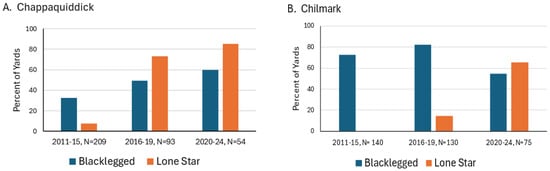 Sample sizes for Chappaquiddick and the town of Chilmark were large enough to examine how the proportion of yards with at least three BL or LS ticks changed over time (Figure 3). In 2011–2015, 8% and 0% of yard surveys had at least three LS ticks for Chappaquiddick and Chilmark, respectively. In 2020–2024, their abundance increased to 85% of yards on Chappaquiddick and 65% for Chilmark. The proportion of yards with BL ticks was variable. Initially, in 2011–2015, the frequency of yards with at least three BL ticks in Chilmark was 73%, compared with only 33% on Chappaquiddick. On Chappaquiddick, BL ticks gradually became more common, increasing from 33% to 50% in 2020–2024. However, in Chilmark, BL frequencies declined from 82% of surveyed yards in 2016–2019 to 55% in 2020–2024.