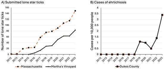 (A) Number of lone star ticks (Amblyomma americanum) for the state of Massachusetts submitted to TickReport [30] for pathogen testing from 2012 to 2023. Data represent adults and nymphs that had human hosts; N = 742. (B) Reported cases of ehrlichiosis for residents of Dukes County (pop. ~20,868), which includes Martha’s Vineyard and the town of Gosnold (pop. < 100) [36].