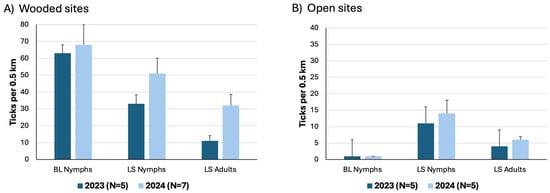 At the wooded sites, the densities of BL nymphs per 0.5 km averaged 63 in 2023 and 68 in 2024, while those of LS nymphs averaged 33 and 51, respectively (Figure 5, Table 2, Supplementary Table S3). At each wooded site and year, we collected more BL nymphs than LS nymphs, and the average ratios of BL nymphs to LS nymphs were 2.1:1.0 in 2023 and 1.4:1.0 in 2024. Paired t-tests showed that the density of BL nymphs was significantly greater than that of LS nymphs each year (p < 0.01).