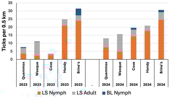 Very few BL ticks were found at the five open sites, all of which were sampled in both years (Figure 5 and Figure 6). The densities of LS nymphs per 0.5 km averaged 11 and 14 across sites in 2023 and 2024, respectively, while those of LS adults averaged 4 and 6 per 0.5 km each year. The average LS densities varied across sites and were as great as 20–25 LS nymphs per 0.5 km at Brine’s Meadow and Handy Meadow (Figure 6). In both years, the greatest density of LS adults was seen at Wasque Meadow, averaging 9 vs. 11 LS adults per 0.5 km in 2023 vs. 2024, respectively. Clusters of LS larvae were not found at any of the five open sites.