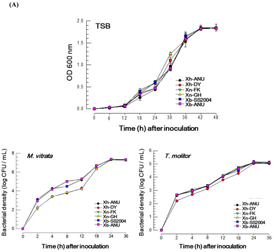 The six Xenorhabdus strains were cultured under three different conditions: TSB and two different insect hosts (Figure 2A). In the TSB medium, all six strains sustained the lag phase for 12 h pi, progressed to the log phase until 42 h pi, and then entered the stationary phase. There was minimal variation (F = 3.32; df = 5, 108; p = 0.0078) in the growth rates of the bacterial strains in TSB medium. Conversely, the bacterial populations in the insect host, M. vitrata, grew rapidly, reaching a stationary phase by 24 h post-inoculation. Significant differences (F = 129.53; df = 5, 96; p < 0.0001) were observed among the growth rates of these bacterial strains. In T. molitor, the bacteria also exhibited rapid growth similar to that in M. vitrata, with relatively minor variations (F = 18.71; df = 5, 96; p < 0.0001) compared to M. vitrata in terms of bacterial growth rates.
