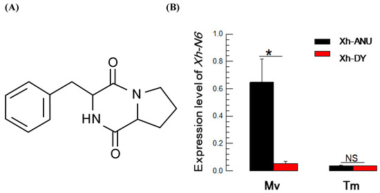 cPF (Figure 6A) was identified in the bacterial culture broth of X. hominickii and predicted to be produced by the Xh-N6 catalytic machinery [12]. It was also detected in our current assays. It was detected in the virulent strains of the three bacterial species. The virulent properties of cPF were analyzed by assessing its synthetic gene analysis (Figure 6B). Xh-N6 was highly expressed in the virulent strain Xh-ANU compared to Xn-DY in M. vitrata. However, its expression did not differ in T. molitor. cPF inhibited PLA2 activities extracted from the insects, inhibiting PLA2s of M. vitrata more than those of T. molitor (Figure 6C). It also inhibited PO activities in the insects, with PO from M. vitrata being more susceptible than that of T. molitor (Figure 6D). The addition of cPF significantly enhanced the bacterial virulence (left panel in Figure 6E). The tolerance of T. molitor to the bacterial infection was reduced with the addition of cPF (right panel in Figure 6E).