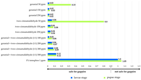 - Fujiwara, G.M.; Annies, V.; de Oliveira, C.F.; Lara, R.A.; Gabrie, M.M.; Betim, F.C.M.; Nadal, J.M.; Farago, P.V.; Dias, J.F.G.; Miguel, O.G.; et al. Evaluation of larvicidal activity and ecotoxicity of linalool, methyl cinnamate and methyl cinnamate/linalool in combination against Aedes aegypti. Ecotoxicol. Environ. Saf. 2017, 139, 238–244. [Google Scholar] [CrossRef]