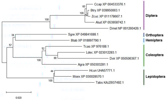 Amino acid sequences of C. capitata Vha68-1, dsRNase1 and dsRNase2 were used as queries in BLASTp and tBLASTn analyses to identify homologous sequences across various insect orders. The resulting amino acid sequences were aligned using ClustalW, and the alignments for Vha68-1 and dsRNases were used to construct neighbor-joining (NJ) trees with 500 bootstrap replicates with the MEGA X software (version 11.0.13) []. Due to the low conservation of dsRNases sequences from positions 1 to 250, the alignment was trimmed to exclude poorly aligned regions.