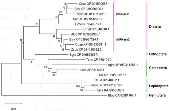NJ tree of the dsRNases proteins. The accession numbers of the sequences are shown near the abbreviation. The bootstrap support percentages are shown next to the branches. Ccap, Ceratitis capitata; Btry, Bactrocera tryoni; Zcu, Zeugodacus cucurbitae; Alud, Anastrepha ludens; Dmel, Drosophila melanogaster; Sgre, Schistocerca gregaria; Btab, Bemisia tabaci; Tcas, Tribolium castaneum; Ldec, Leptinotarsa decemlineata; Dvir, Diabrotica virgifera virgifera; Agra, Anthonomus grandis; Hcun, Hyphantria cunea; Msex, Manduca sexta; Tabs, Tuta absoluta.