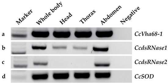 Semiquantitative analysis of CcVha68-1, CcdsRNase1, CcdsRNase2 and CcSOD genes on cDNA from whole body, head, thorax, and abdomen. (a) CcVha68-1 expression shows a 553 bp band in all samples; (b) CcdsRNase1 expression shows a 613 bp band in all samples, with higher intensity in the abdomen; (c) CcdsRNase2 expression shows a 557 bp band exclusively in the abdomen; (d) CcSOD expression (housekeeping) shows a 300 bp band in all samples (the lack of a 128bp-long intron in the amplified CcSOD DNA product indicted a gDNA-free cDNA sample; see Figure S5). For original agarose gels, see Figure S6.