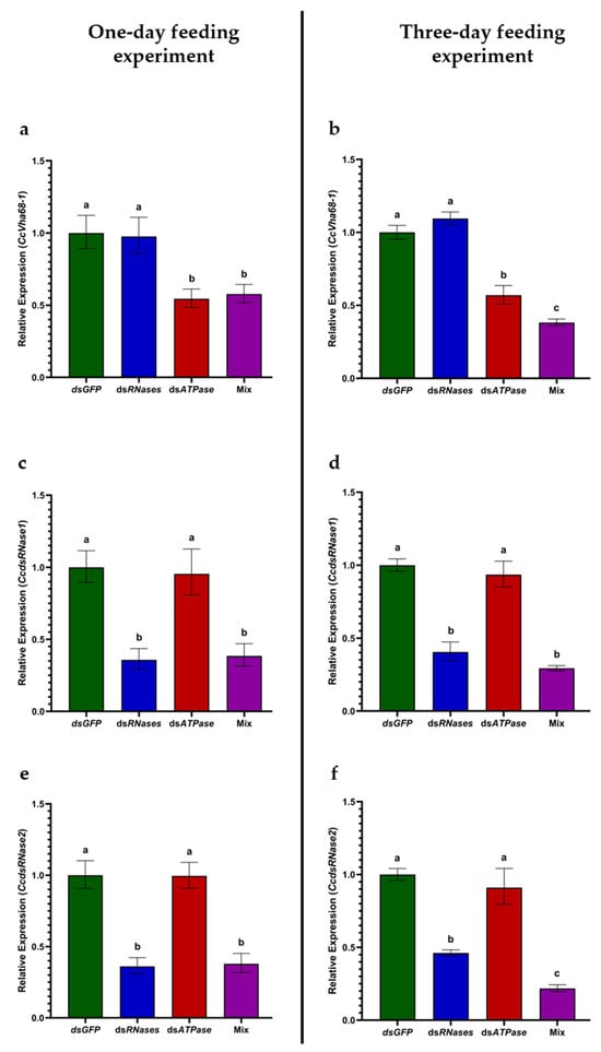 Transcript levels of CcVha68-1, CcdsRNase1 and CcdsRNase2 post one-day and three-day treatments. Different letters denote a significant difference between mean values recorded for each group (the obtained values passed normality tests). The values reported are the mean ± standard error. (a) Relative expression of CcVha68-1 post one-day treatment (one-way ANOVA: F(3,28) = 7.855, p < 0.001); (b) relative expression of CcVha68-1 post three-day treatment (one-way ANOVA: F(3,27) = 47.09, p < 0.0001); (c) relative expression of CcdsRNase1 post one-day treatment (one-way ANOVA: F(3,28) = 15.92, p < 0.0001); (d) relative expression of CcdsRNase1 post three-day treatment (one-way ANOVA: F(3,28) = 37.9, p < 0.0001); (e) relative expression of CcdsRNase2 post one-day treatment (one-way ANOVA: F(3,28) = 24.08, p < 0.0001); (f) relative expression of CcdsRNase2 post three-day treatment (one-way ANOVA: F(3,28) = 59.01, p < 0.0001).