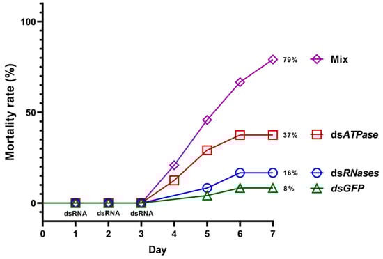 The normality of the data obtained through real-time analysis was assessed using the Shapiro–Wilk and Kolmogorov–Smirnov tests. The expression levels of the target genes in different biological groups were analyzed using the one-way ANOVA test. When significant effects were observed (p-value < 0.05), Dunnett’s test was used for multiple comparisons. Survival curves of the different biological groups analyzed after dsRNA treatment were compared using the log-rank test (Mantel–Cox). The ex vivo degradation assay data were analyzed using the two-way ANOVA test, as affected by dsRNA treatment and time post-treatment. All statistical analyses were performed using GraphPad Prism 9.0 (GraphPad Software, San Diego, CA, USA).