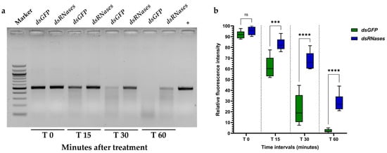 Eight flies (four males and four females) were fed with dsRNA drops (eight flies fed dsGFP and eight flies fed dsRNases) for three days, as previously described. On the fourth day, the flies were dissected in phosphate-buffered saline (PBS 1X) to collect the gut from the mouth to anus, excluding the crop and Malpighian tubules. The single dissected eight guts were placed in Eppendorf tubes and resuspended in 10 μL of PBS 1X. After a mild centrifugation step at 3000× g for 5 min to allow for the release of the gut juice, the supernatants were collected and refrigerated at 4 °C for 16 h to enable enzymes to diffuse into the solution. Then, 100 ng of dsATPase was added to a diluted solution (1:20) of supernatant and incubated at RT for four time points (0, 15, 30, and 60 min). Samples from each time point were stored at −20 °C until visualization using 1.5% agarose gel electrophoresis. Band fluorescence intensities were measured using Image Lab™ software (version 6.1.0.7) (Bio-Rad, Hercules, CA, USA).