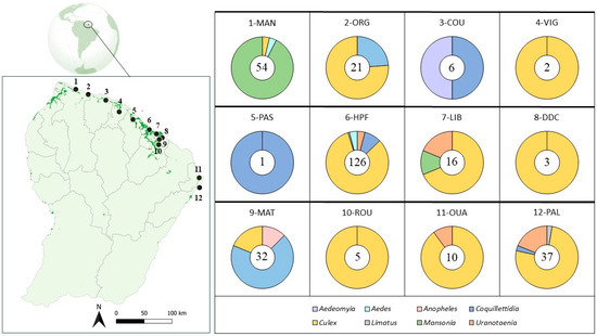 Localization of the 12 sampling sites in French Guiana, along with the genus proportion of blood-fed mosquitoes (depicted as pie charts) and the numbers of blood-fed females for each site (indicated in the middle of the chart). The sites, arranged from west to east, are named as follows: Mana (1-MAN), Organabo (2-ORG), Counamama (3-COU), Viguié (4-VIG), Passoura (5-PAS), Hameau Préfontaine (6-HPF), Pointe Liberté (7-LIB), Dégrad des Cannes (8-DDC), Matoury (9-MAT), Roura (10-ROU), Ouanary (11-OUA), and Trois Palétuviers (12-PAL). Urban fabric coverage is indicated in deep green on the map.