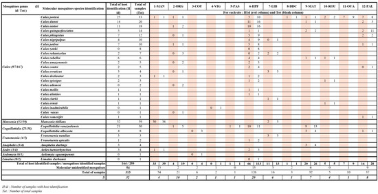 Among the 32868 mosquitoes trapped over a 5-year period, a total of 313 of blood-fed females were collected from 12 sites. Most specimens belong to the Culex (Cx.) genus (59%), followed by seven other genera: Mansonia (Ma.) (17%), Coquillettidia (Cq.) (14%), Uranotaenia (Ur.) (5%), Aedes (Ae.) (2%), Anopheles (An.) (1%), Limatus (Li.) (1%), and Aedeomyia (Ad.) (1%). Molecular barcoding of blood-fed females based on Sanger sequencing of the COI fragments allowed the identification to species level of 259 specimens (84% of the collection). The five most abundant species were Ma. titillans with 12% (32/259), Cx. portesi with 10% (25/259), Cq. venezuelensis with 8% (21/259), Cx. dunni with 5% (14/259), and Cx. eastor with 4% (11/259) (Figure 2).