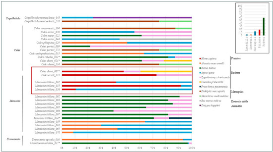 The MinION nanopore sequencing method was used for detection and identification of multiple blood meals. A total of 31 samples, corresponding to 12 species of mosquitoes, were found with multiple blood meals (Figure 3). The majority, 84% (26/31), consisted of two different blood meals, but five blood meals were found with three host species. Only mammals were found in the multiple composition of blood meals, including humans, non-human primates, rodents, marsupials, domestic cattle, and armadillos. Human blood meals were found mixed with other mammals in five samples from three different species: three Ma. titillans, one Cx. dunni, and one Cx. ernsti. All samples were mixed with rodents. An analysis of the number of reads by host type shows mostly rodent reads (60% of the total number of reads) (Figure 3).