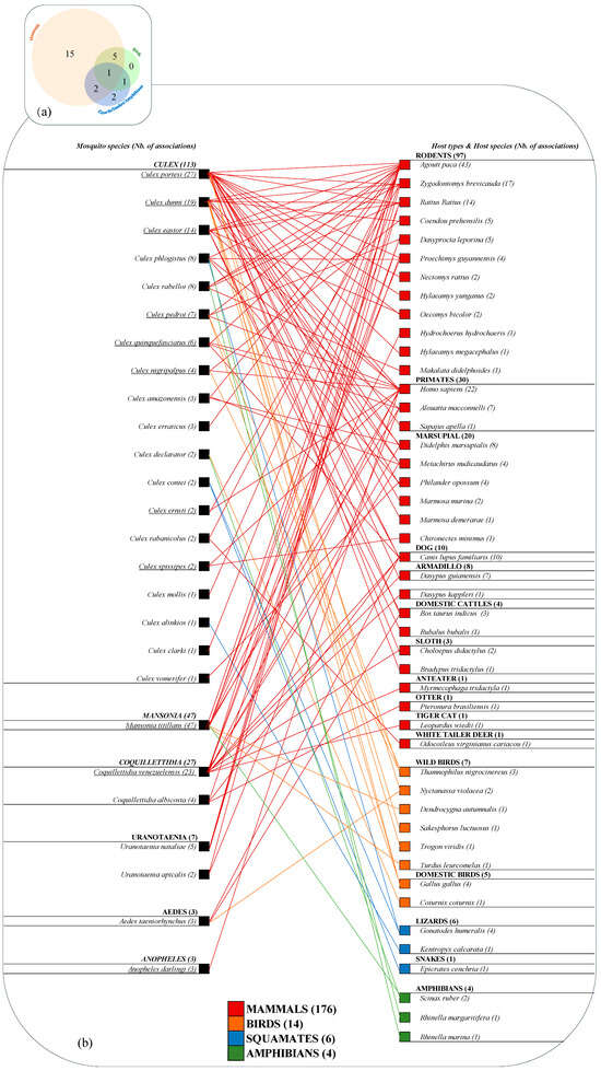Distribution of mosquito species according to their blood-meal composition. (a) Venn diagram of the distribution of the number of mosquitoes species by class of host; (b) Composite image illustrating mosquito and host associations from the study. The number of associations is indicated within brackets. Species are ordered according to their number of associations, from the highest to the lowest. Red links correspond to mammals, orange links to birds, blue links to lizards and snakes, and green links to amphibians. Mosquito species found with human blood are underlined.