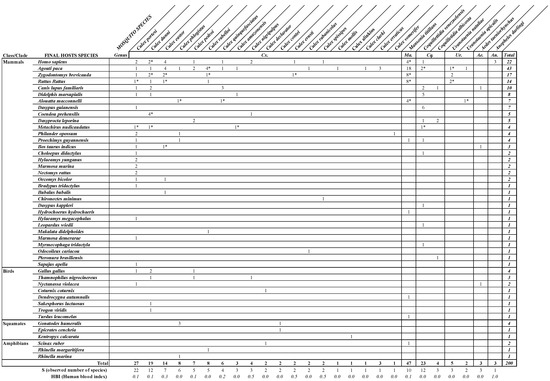 Distribution of samples for each mosquito species according to the source species of host-blood meals, organized by class and by highest to lowest number. Observed number of species and human blood index (HBI) are provided at the bottom, for each mosquito species. A star “*” is present next to samples that include multiple blood meals.