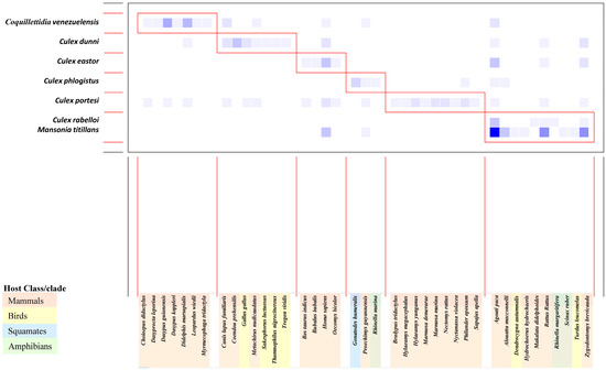 Interaction matrix highlighting modular relationships between vertebrate blood-meal sources and adult female mosquitoes that fed upon them. Boxes delineate modules, with darker squares indicating a greater number of detected interactions, gradually transitioning to lighter colors to represent fewer interactions detected. Host classes/clades are indicated by color codes as shown in the figure.
