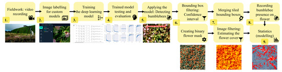 However, modern methods, such as using video recording to observe the foraging behaviour of insect floral visitors around flower sources present an opportunity for increasing efficiency, decreasing disturbance, and saving human labour. When combined with state-of-the-art technologies, including computer vision and deep learning techniques, video recordings can provide novel solutions to species identification [47,48] and monitoring communities [44] or insect pests [49]. Indeed, these methods are increasingly used in pollination ecology to detect flower-visiting insects (e.g., [50,51]), and recent trends suggest that the future of pollinator research is going to be shaped by the use of artificial intelligence (AI)-based tools [52,53,54]. Despite their numerous advantages, few studies use these methods to monitor pollinators in real time (but see [55,56]) and even less to examine the behaviour of unmarked insects outdoors, under natural or near-natural conditions (but see [57,58]). One of the reasons may be that, whilst the application of AI tools rarely needs any specialised technological hardware, at their current development stage, these methods often require specific computational skills, which extend beyond the expertise of most ecologists. The intensive use of a non-ecology-related discipline thus highlights the need for enhancing collaboration between ecologists and computer scientists [59].