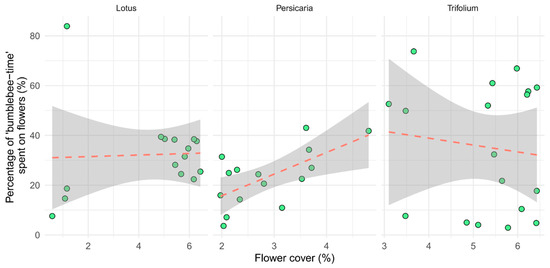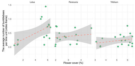We found that the number of bumblebees visiting a patch depended solely on the flower cover and not on the plant species. This aligns with the findings of Vaca-Uribe et al. (2021) [82] who reported a positive relationship between the blooming cover and the abundance of insect visitors. In our study, the observed dependency on flower cover was particularly evident with Lotus, where patches with low flower cover had fewer bumblebees, while higher flower cover attracted a higher number of individuals, and this relationship between the flower cover and the number of bumblebees remained even after excluding outliers with extreme low cover values. One of the reasons for this is likely that in denser flower patches, bumblebees can spend more time handling inflorescences, minimizing the energy costs that would be spent searching for a new patch and maximizing resource uptake. However, the exact relationship between increasing cover and bumblebee visitation and its environmental drivers is challenging to determine, as we did not sample flower patches with intermediate flower cover.