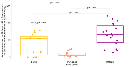 The average number of bumblebees visiting flower patches at the same time (standardised for flower cover) separated by plant species. The global p-value for the ANOVA test is shown in the figure, as are the pairwise comparisons (t-tests) of the averages between plant species. The dashed line shows the mean of the y-axis. Each point represents one video (n = 15, 15, and 18, for Lotus, Persicaria, and Trifolium, respectively).