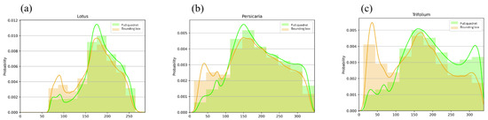 To have a visual overview of the differences in the handling time between plants, we generated histograms of the frequency of colour deviations from the OFC for both areas on the heatmap where bounding boxes (i.e., bumblebees) were present and from the whole heatmap (full quadrat). For this, we took random samples of 100,000 points (or as many as were available if less than 100,000 points) for bounding boxes and total areas for each plant species (see the detailed computer code on the link https://github.com/zsvargaszilay/exploring_foraging_behaviour_with_computer_vision, accessed on 8 July 2024).