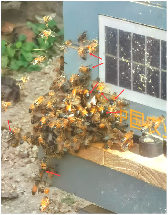 The robber bees gathering at the entrance to a hive (red arrows point to robber bees).