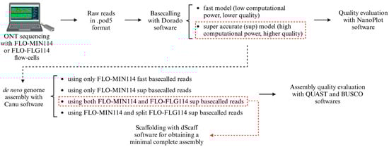 - Ni, Y.; Liu, X.; Simeneh, Z.M.; Yang, M.; Li, R. Benchmarking of Nanopore R10.4 and R9.4.1 flow cells in single-cell whole-genome amplification and whole-genome shotgun sequencing. Comput. Struct. Biotechnol. J. 2023, 21, 2352–2364. [Google Scholar] [CrossRef]