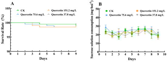 Three concentrations of quercetin (Sigma–Aldrich Co., Saint Louis, MO, USA, purity 95%) at 151.2, 75.6, and 37.8 mg/L, and a control group (CK), were used. Our previous studies demonstrated that these concentrations of quercetin effectively regulate pesticide tolerance in A. cerana [37]. The preparation procedures for treatment solutions containing phytochemicals have been previously described by Wong et al. [31]. A sterile sucrose solution was used to prepare the treatment solutions, each containing the corresponding phytochemical test concentrations and 0.25% dimethyl sulfoxide (DMSO) (w/w). Following a 24 h acclimatization, the bees were starved for 2 h, and then 4 mL of treatment solution containing DMSO with or without phytochemicals was randomly provided to each cage. The phytochemical treatments continued for 5 or 9 days. During the experimental period, the cages were maintained at 30 °C and 60% humidity. The treatment solution was refreshed and weighed daily, and dead bees were removed after daily survival checks.