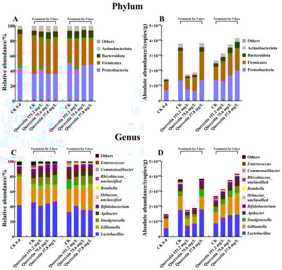 Figure 2. Classification analysis of the gut microbiota community of the worker bees at phylum and genus levels. (A) Relative abundance of dominant bacterial communities at the phylum level; (B) absolute abundance of dominant bacterial communities at the phylum level; (C) relative abundance of dominant bacterial communities at the genus level; (D) absolute abundance of dominant bacterial communities at the genus level. CK, control group.