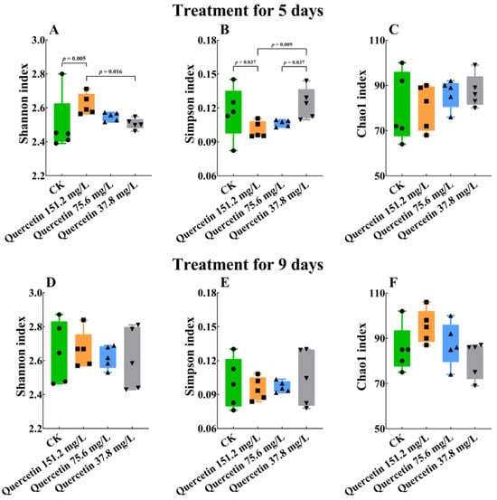 Figure 3. Alpha diversity between the control and quercetin treatment groups, measured by the Shannon, Simpson, and Chao1 indices. (A) Shannon index at 5 days. (B) Simpson index at 5 days. (C) Chao1 index at 5 days. (D) Shannon index at 9 days. (E) Simpson index at 9 days. (F) Chao1 index at 9 days. Tested for differences between groups using Kruskal‒Wallis analysis, α = 0.05. CK, control group.