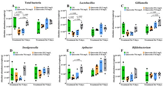 On day 9, the results showed that only Gilliamella abundance differed significantly (Figure 4C; Kruskal‒Wallis: H = 10.58, df = 3, 16, p = 0.01 < 0.05). Gilliamella abundance in the 37.8 mg/L quercetin group was significantly higher than that in the control (p < 0.01) and the 151.2 mg/L (p = 0.01 < 0.05) quercetin groups. However, no intergroup differences were observed in Snodgrassella (Figure 4D; Kruskal‒Wallis: 5 d: H = 4.13, df = 3, 16, p = 0.25 > 0.05; 9 d: H = 1.70, df = 3, 16, p = 0.64 > 0.05) and Bifidobacterium (Figure 4F; Kruskal‒Wallis: 5 d: H = 3.11 df = 3, 16, p = 0.37 > 0.05; 9 d: H = 1.61, df = 3, 16, p = 0.66 > 0.05) abundance on either day 5 or 9.
