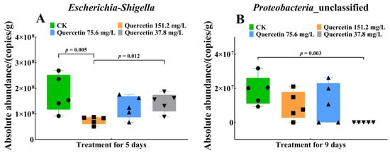 Among the non-dominant bacteria, differences in the abundance of one genus were observed between groups in the 5 d and 9 d quercetin treatment groups. On day 5, differences were observed in Escherichia-Shigella abundance (Figure 5A; Kruskal‒Wallis: H = 9.63, df = 3, 16, p = 0.02 < 0.05). Escherichia-Shigella absolute abundance in the 151.2 mg/L quercetin group was significantly lower than that in the control (p < 0.01) and the 37.8 mg/L (p = 0.01 < 0.05) quercetin groups. On day 9, differences were observed in Proteobactera-unclassified abundance (Figure 5B; Kruskal‒Wallis: H = 9.24, df = 3, 16, p = 0.03 < 0.05). The abundance in the 37.8 mg/L quercetin group was significantly lower than that in the control group (p < 0.01). However, no significant differences were observed between the control, the 75.6 mg/L (p = 0.07 > 0.05), and the 151.2 mg/L (p = 0.07 > 0.05) quercetin groups.