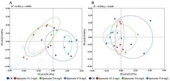 Figure 6. Beta diversity analysis using principal coordinate analysis (PCoA) based on the Bray‒Curtis dissimilarity index for absolute abundance at 5 days (A) and 9 days (B). Tested for differences between groups using PERMANOVA analysis, α= 0.05. CK, control group.