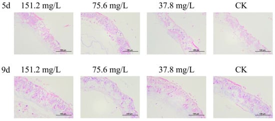 Figure 7. Cross sections of the gut of worker bees under quercetin treatment on days 5 and 9, with hematoxylin and eosin staining (200×).