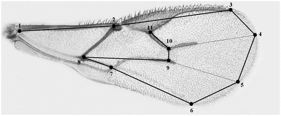The wing size of the females used for the tests was measured. Wing sizes of the parasitoids from each experimental group were measured as centroid size [5,24]. Wing size is positively correlated with body size as a whole and is a considerably easier feature to measure accurately [24]. It has also been shown that in A. ervi, wing CS was highly correlated with thorax length, head width, and tibia length [5]. Briefly, left wings were dissected, dehydrated in ethanol, and mounted on glasses in lactic acid/ethanol (6:5). Wing images were captured using a Nikon optical microscope mounting a digital camera (Nikon, Tokyo, Japan). The 50 × optical magnification was subsequently enlarged through a 2 × digital zoom. The images were used to record 11 morphological landmarks (Figure 1) and wing size was estimated as centroid size (CS). CS is defined as the square root of the sum of the squared distances of a set of landmarks from their geometric centre (the centroid).