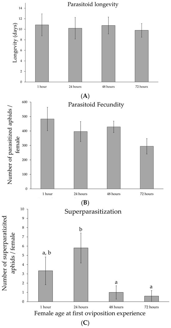 Reproductive behaviour of the parasitoid of Aphidius ervi. Mean values (±standard errors) of the parasitoid longevity (A), fecundity (B), and superparasitization (C) as a function of female age at the first oviposition—1 h: N = 12; 24 h: N = 11; 48 h: N = 11; 72 h: N = 11. Different lower case letters indicate Tukey post hoc differences.