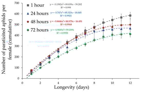 The cumulative number of parasitized aphids over time was used as an indicator of the fitness of the experimental groups to better understand the reproductive behaviour of the parasitoid. The best fit for cumulative fecundity over time was given by second-order polynomials (Figure 3).