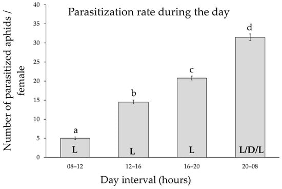The parasitization rate during the 24 h cycle. Mean values (±standard errors) of the parasitoid rate of 24 h old females as a function of four different time intervals during the day. N = 17. L: light; D: dark. Different lower case letters indicate Tukey post hoc differences.
