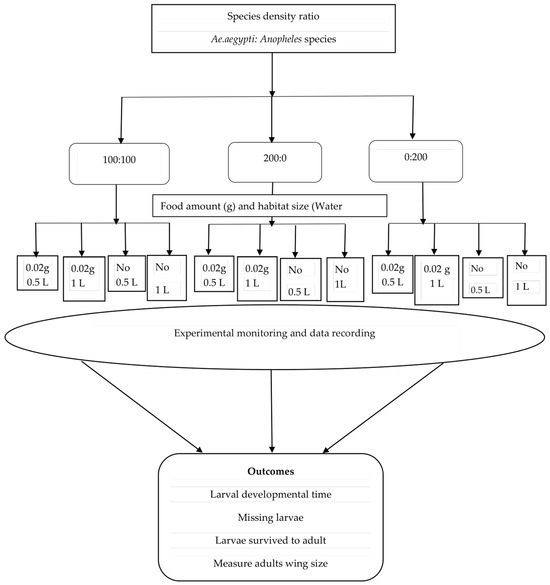 Schematic presentation of the experimental setup and procedures for inter and intraspecific competition between Aedes aegypti and either Anopheles arabiensis, Anopheles gambiae, and Anopheles funestus in small and large habitat sizes.
