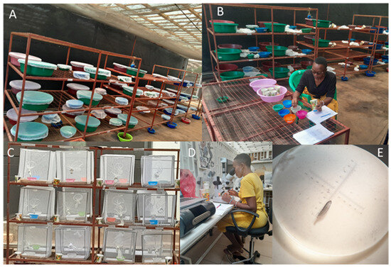 (A) Artificial larval habitats consisting of small and large plastic basins used for larval rearing. (B) Daily monitoring of larval survival, including counting of alive larvae, dead larvae, missing larvae, alive pupae, and dead pupae. (C) Collected pupae were transferred to small plastic bowls with water and placed in net cages for adult emergence. (D) Emerged mosquitoes were taken to the laboratory for wing size measurement. (E) Wing size observed under a microscope as a proxy for adult body size.