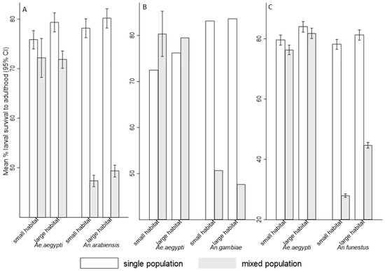 Mean percent (95% CI) of larvae survived to adulthood for (A) Aedes aegypti and Anopheles arabiensis, (B) Aedes aegypti and Anopheles gambiae, and (C) Aedes aegypti and Anopheles funestus exposed in single and mixed population across small and large habitats. Bar graphs without error bars indicate extremely narrow confidence intervals.