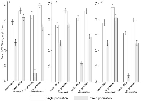 Mean (95% CI) wing length of female (A) Aedes aegypti with Anopheles arabiensis, (B) Aedes aegypti with Anopheles gambiae, and (C) Aedes aegypti with Anopheles funestus in single and mixed population across different habitat size.
