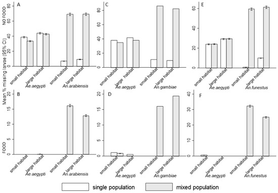 Mean percent (95% CI) of missing larvae in both absence and presence of food for (A,B) Aedes aegypti and Anopheles arabiensis, (C,D) Aedes aegypti and Anopheles gambiae, and (E,F) Aedes aegypti and Anopheles funestus exposed in single and mixed population across small and large habitats. Bar graphs without error bars indicate extremely narrow confidence intervals.