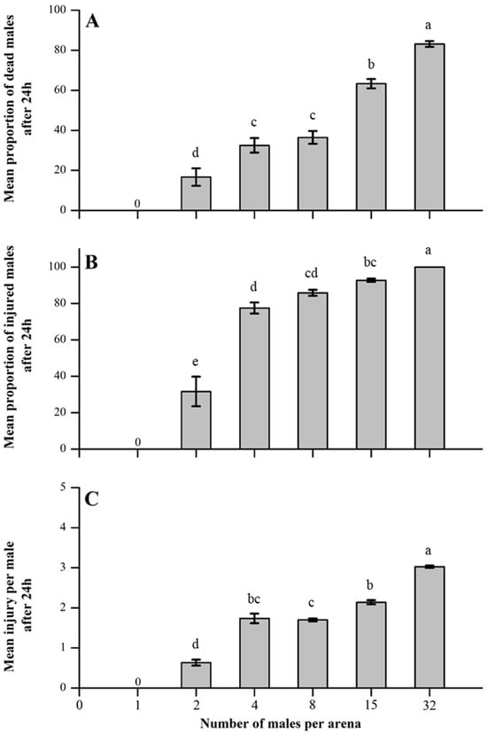Impact of competitor density on male–male fighting intensity among A. japonicus. Fighting intensity was noted as the (A) mean proportion of dead males, (B) mean proportion of males injured, and (C) mean injury per male after 24 h. Error bars are used to express standard errors, and different letters on bars denote significant differences at p < 0.05.