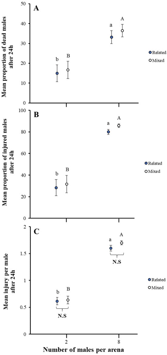 Impact of related and mixed males group size on fight intensity in A. japonicus. Fight intensity was noted as the (A) proportion of dead males, (B) proportion of males injured, and (C) mean injury per male after 24 h. Error bars are used to express standard errors, and different letters on bars denote significant differences at p < 0.05. Both relatedness and mixed factors have no significant differences and are marked as N.S only at the bottom.