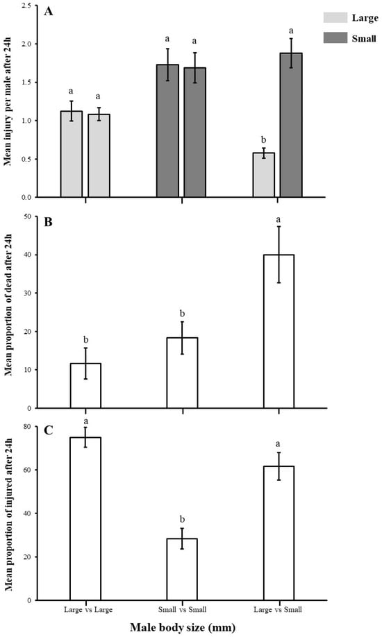 The results demonstrate that the size of the male A. japonicus has a significant impact on the proportion of injuries and dead males; however, a non-significant impact on the mean injury was recorded in experimental males. The mean injury level of both males in large vs. large and small vs. small exhibited no significant differences, meaning that both males were injured during combat (U, large vs. large; U = 10.000, p = 0.194, small vs. small; U = 284.500, p = 0.940). However, males in small vs. small combat showed higher injury levels compared with males in large vs. large combat. Interestingly, in large vs. small male combats, larger males showed dominance over smaller males, and their mean injury was significantly lower than smaller ones (χ2 = 13.500, p < 0.05) (Figure 3A).