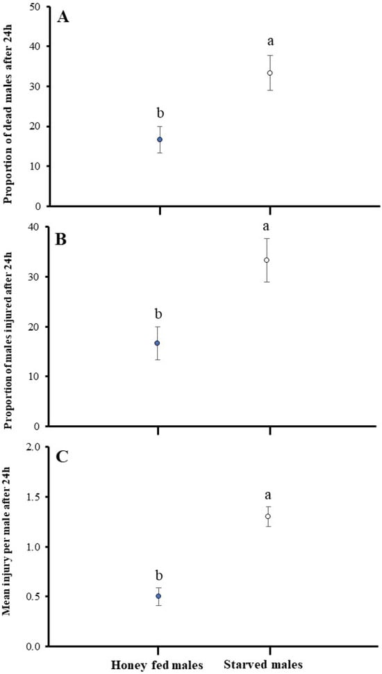 The results demonstrate that the honey-fed males show dominance over starved ones and have a significant impact in combat on mean injury per male (U = 17.70, p < 0.05), the proportion of dead (U = 125.670, df = 1, p < 0.05), and the injured male proportion (U = 59.43, df = 1, p < 0.05) (Figure 4).