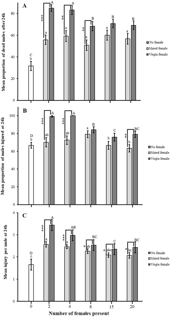 Impact of female presence on fight intensity in A. japonicus. Fight intensity was measured as the (A) proportion of dead males, (B) proportion of males injured, and (C) mean injury per male after 24 h. Error bars are used to express standard errors, and different small letters on bars denote significant differences at p < 0.05 among zero females and mated females; similarly, capital letters represent zero females and virgin females. Asterisk indicates significant differences among virgin and mated females at * p < 0.05, ** p < 0.001, and *** p < 0.0001 for χ2 test.