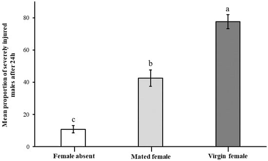 Proportions of males severely injured after combat for 24 h under conditions of no female, mated female, and virgin female. Severe injury generally involves the loss of two legs and whole antennae or even more serious injuries. The different letters indicate significant differences. The error bars indicate means ± standard errors and different letters on bars denote significant differences at p < 0.05.