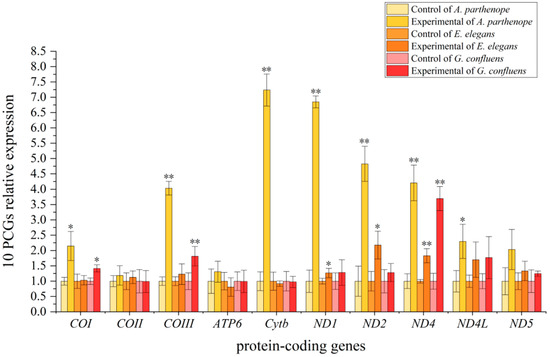 The expression of 10 PCGs from larvae of A. parthenope, G. confluens, and E. elegans comparing control versus experimental conditions (under 0.05 μg/L CPF stress). The x-axis shows gene names. For each gene, 3 pairs of bars are shown. The first (yellow), third (orange), and fifth (red) bars show controls (all standardized to 1.0), whereas the second (yellow), fourth (orange), and sixth (red) bars show the relative gene expression of the experimental data compared to control values. Yellow columns show data for A. parthenope; orange columns show data for E. elegans; and red columns show data for G. confluens. The error bars represent standard deviation. Asterisks indicate significantly different expressions: *, p < 0.05; **, p < 0.01. The value of p was calculated by an independent t-test.