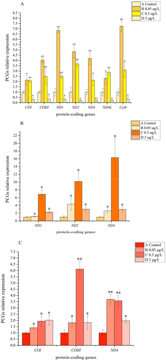 To further investigate the expression mechanisms of genes with up-regulated transcript levels under 0.05 μg/L CPF stress, we further assessed the transcript levels of up-regulated genes under 0.5 μg/L and 5 μg/L CPF stresses. After 24 h all larvae of G. confluens and E. elegans were alive, whereas one larva of A. parthenope occurred death under 5 μg/L chlorpyrifos stress. In the 0.5 μg/L CPF group of A. parthenope, the transcript levels of several genes were still up-regulated significantly (p < 0.05). The transcript levels of COI, COIII, ND1, ND2, ND4, ND4L, and Cytb significantly increased by 1.83 ± 0.14, 2.63 ± 0.84, 2.18 ± 0.19, 3.57 ± 0.28, 1.74 ± 0.42, 2.75 ± 0.28, and 2.15 ± 0.51 fold, respectively (Figure 2). However, in the 5 μg/L experimental group, the transcript levels of COI, COIII, ND1, ND2, ND4, ND4L, and Cytb showed significant levels of reduction (p < 0.01), with the transcript levels of 0.28 ± 0.17, 0.36 ± 0.31, 0.28 ± 0.20, 0.19 ± 0.07, 0.15 ± 0.08, 0.20 ± 0.06, and 0.25 ± 0.16 fold, respectively (Figure 2). For E. elegans, the genes of ND1, ND2, and ND4 were also significantly up-regulated (p < 0.05). The transcript levels of ND1, ND2, and ND4 significantly increased by 6.68 ± 1.21, 6.89 ± 1.57, and 17.67 ± 5.35 fold, respectively (Figure 2). In the 5 μg/L experimental group, the transcript levels of ND1, ND2, and ND4 significantly increased by 2.19 ± 0.27, 2.04 ± 0.44, and 3.19 ± 0.69 fold, respectively (Figure 2). For G. confluens, both the experimental groups treated with 0.5 μg/L and 5 μg/L CPF were found to be significantly up-regulated in COI, COIII, and ND4 (p < 0.05) (Figure 2). In the 0.5 μg/L experimental group, the transcript levels of COI, COIII, and ND4 were significantly increased by 2.14 ± 0.45, 5.06 ± 0.51, and 3.62 ± 0.46 fold, respectively (Figure 2). In the 5 μg/L experimental group, the transcript levels of COI, COIII, and ND4 were increased by 2.23 ± 0.44, 1.51 ± 0.44, and 1.99 ± 0.18 fold, respectively (Figure 2).